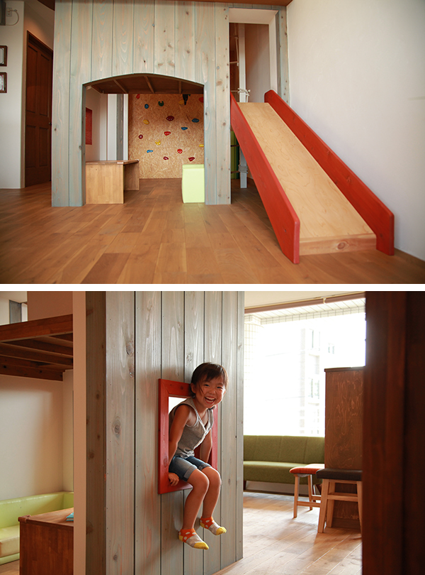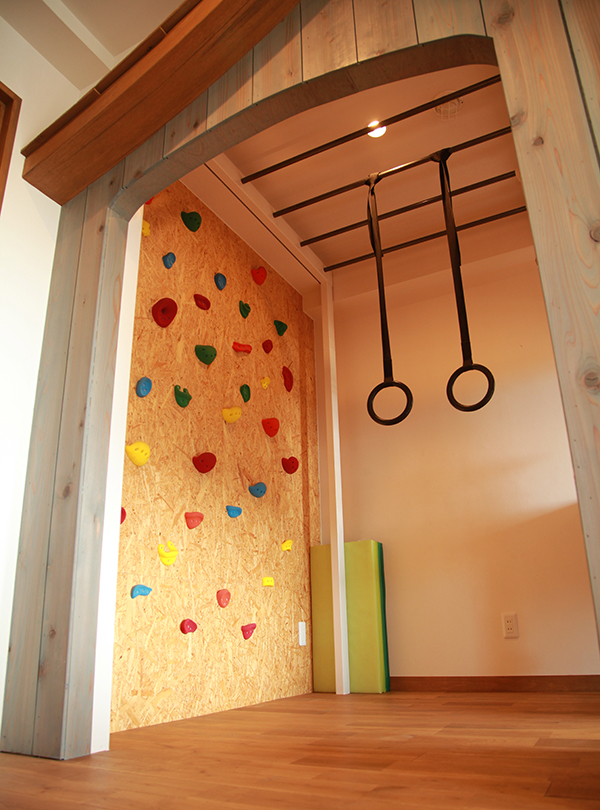 当院のキッズスペースは、ボルダリングウォールをはじめ、吊り輪や鉄棒、ウンテイに滑り台など、お子様に楽しんでいただきながら成長の助けとなるよう、設計士さんと何度も打ち合わせをしたこだわりのキッズスペースとなっています。