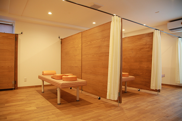 また、施術室はプライベート感をだす為に、オーダーメイドのパーテーションで個室空間を演出。色々なお体の悩みをお打ち明けいただきたいという想いがあり、こだわって施設設計致しました。